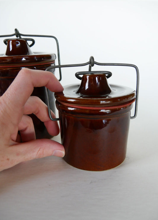 Vintage Brown Glazed Butter Crock with Metal Fastener