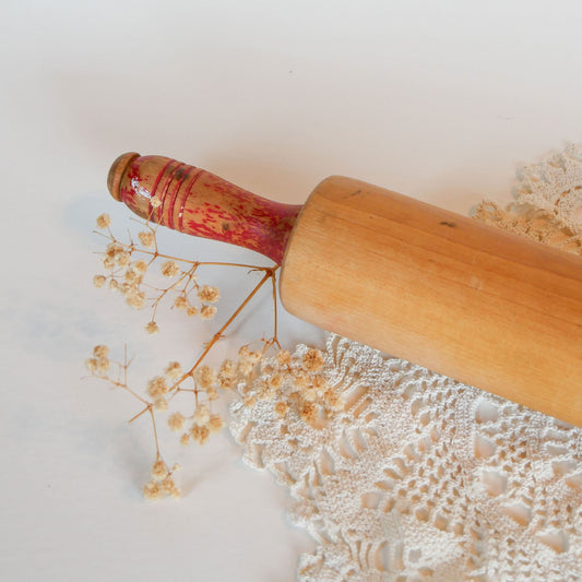 Vintage 18in Wooden Rolling Pin with Chippy Red Handles