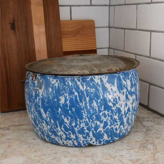 Vintage Large Blue and White Swirl Graniteware Pot and Lid