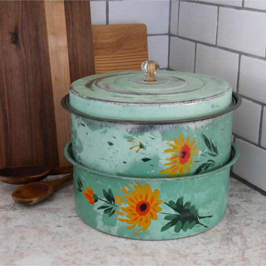 Vintage Green and Yellow Sunflower Metal Cake Carriers