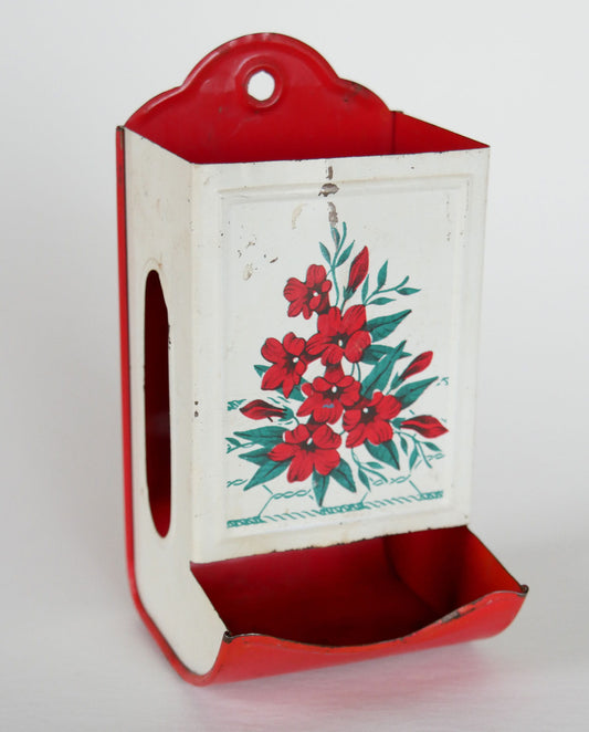 Vintage Red Floral Metal Wall Mounted Matchbox Holder