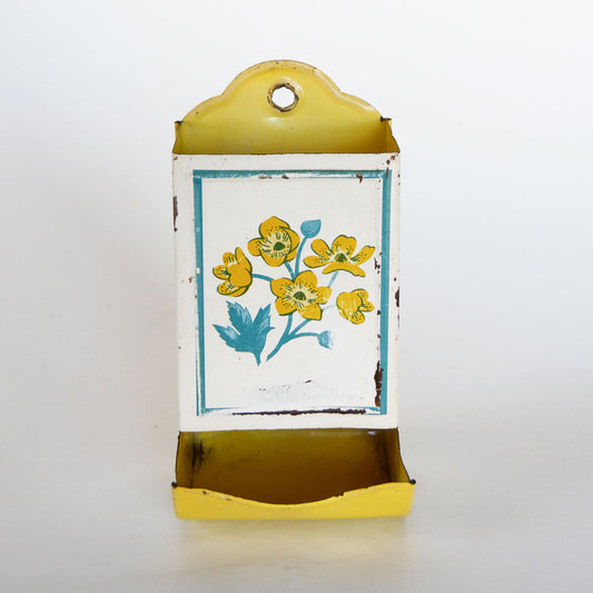 Vintage Yellow Floral Metal Wall Mounted Matchbox Holder