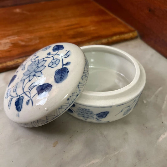 Vintage Hand Painted Porcelian Jewelry Box, Blue and White Porcelian Tricket Dish