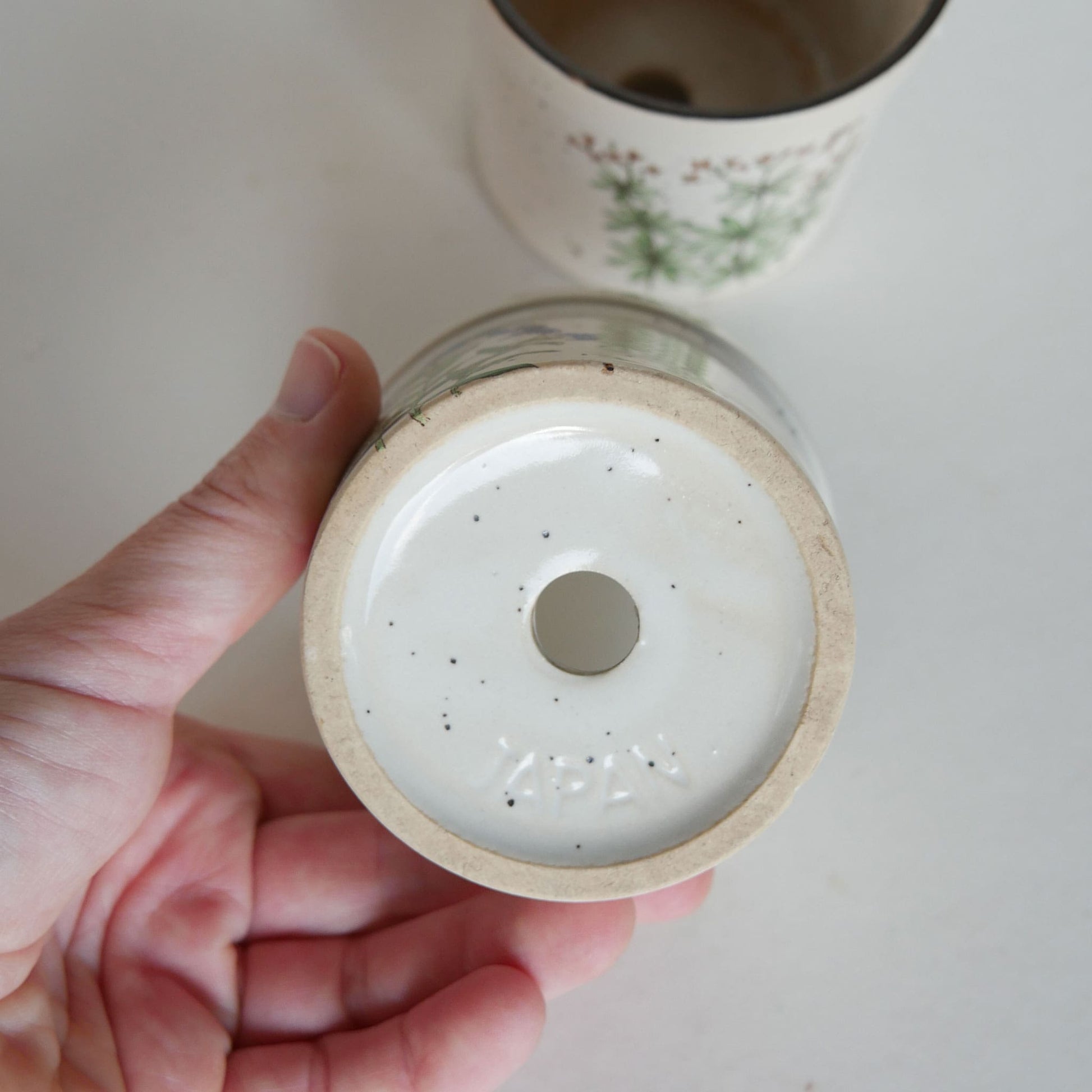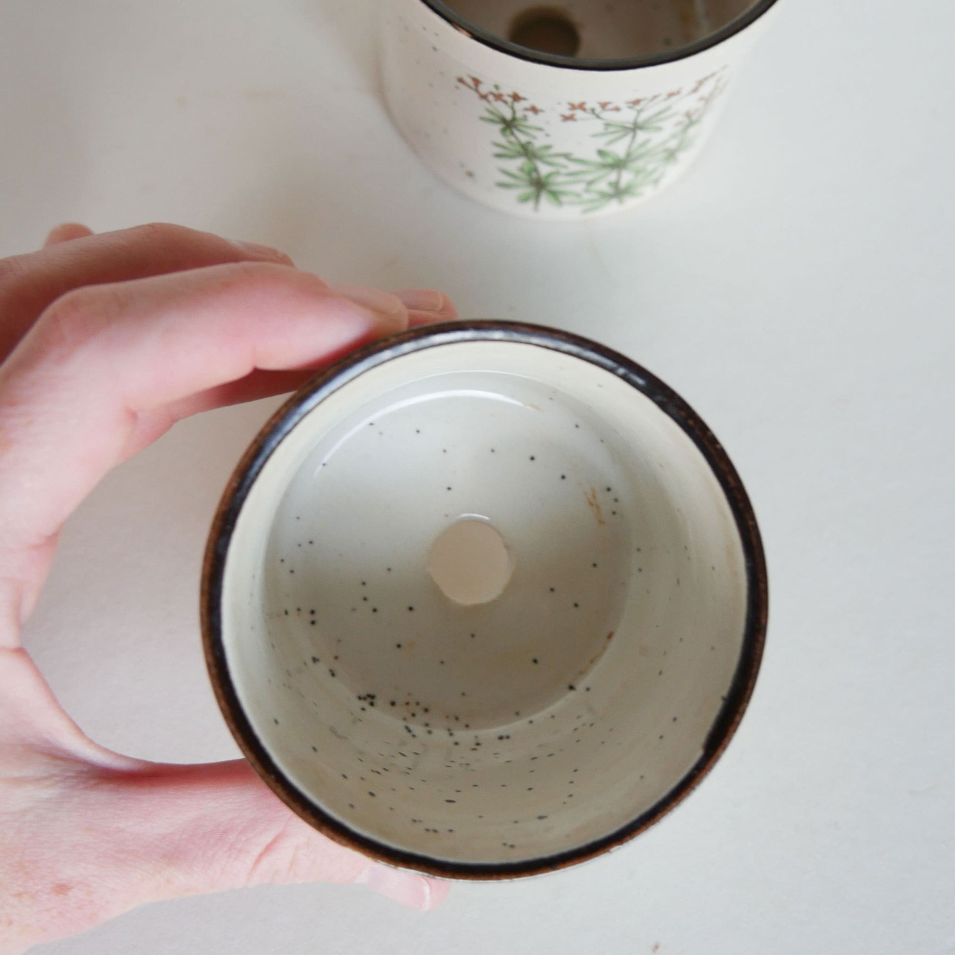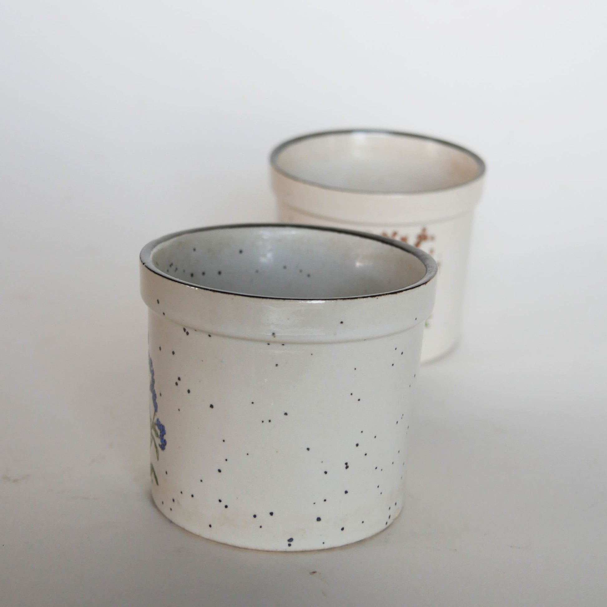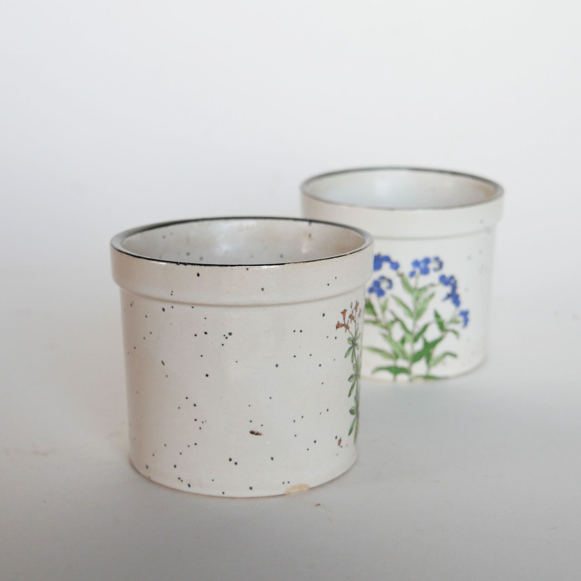 These Mini Vintage Takahashi Speckled Stoneware Flower Pots are the perfect way to add a little cottage charm and greenery to your window sill. One flower pot features blue florals while the other features red florals. Draining holes are the bottom of each pot. Pots do not come with drip tray. Sold separately.